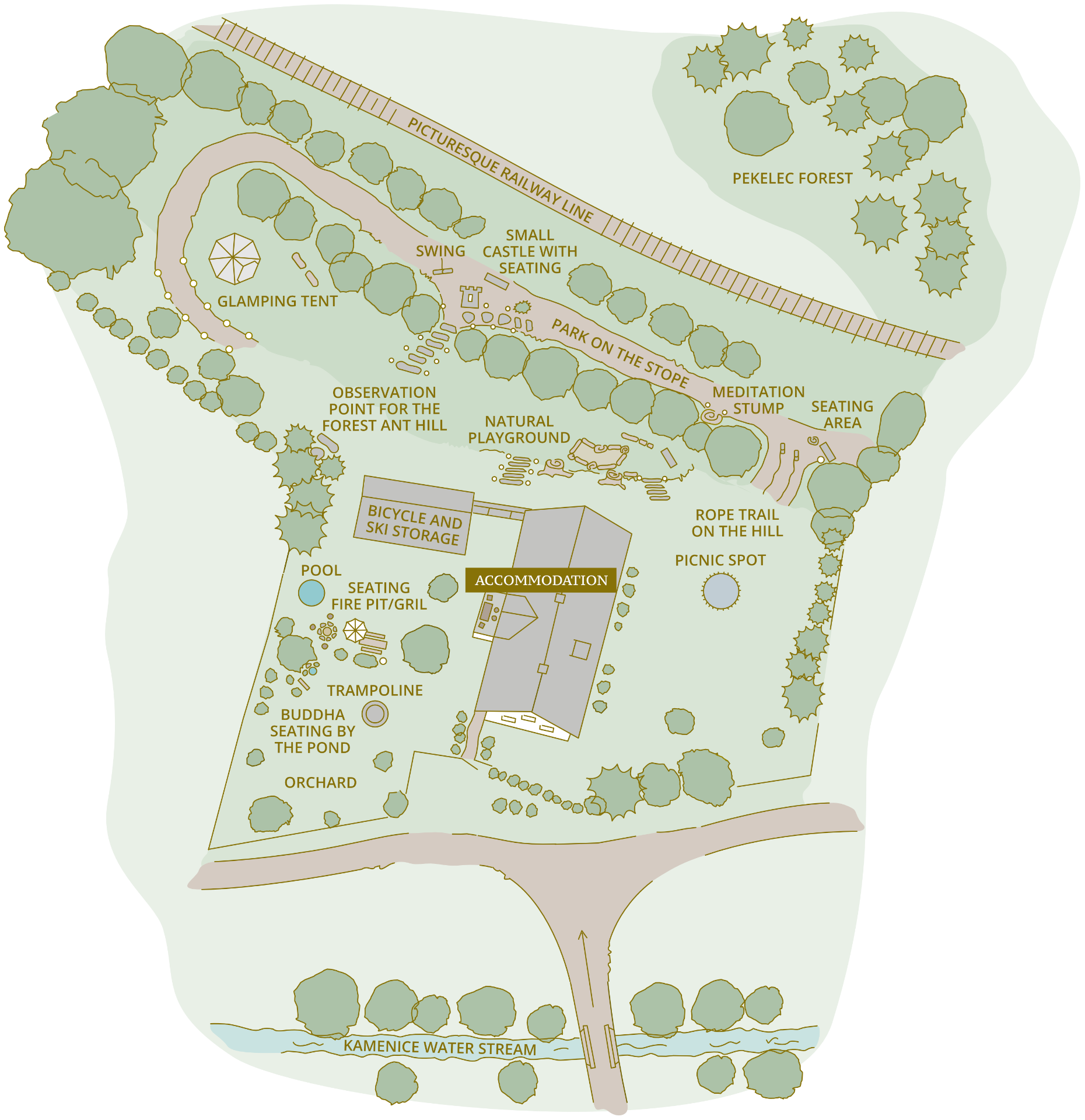 Natural playground for children: sandbox, trampoline, rope trail on the hill, swing, balance trail made of tree trunks, pebble play, observation point for the forest ant hill, glamping tent with toys, meditation tree stump