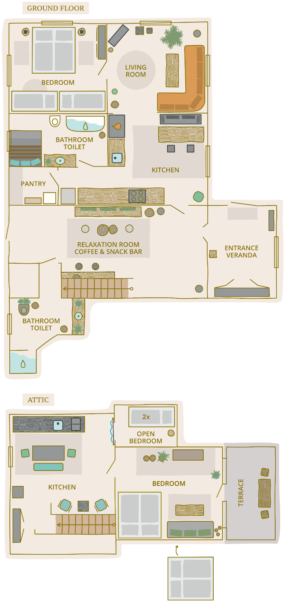 3. Attic bedroom: bunk bed (more suitable for children), connected to the kitchen by an elegant curtain, no window Living room with children's play corner: open-plan living room connected to the kitchen, sofa, smart TV, toys for children, books, board games, children's table and chair