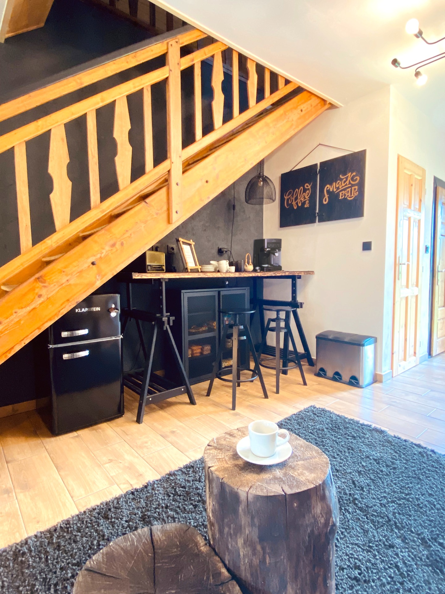 - Relaxation room – Coffee & Snack Bar: Arabica Comfort espresso machine with portafilter, ground coffee, fridge, relaxing seating area, music player (Bluetooth, USB flash drive, CD)