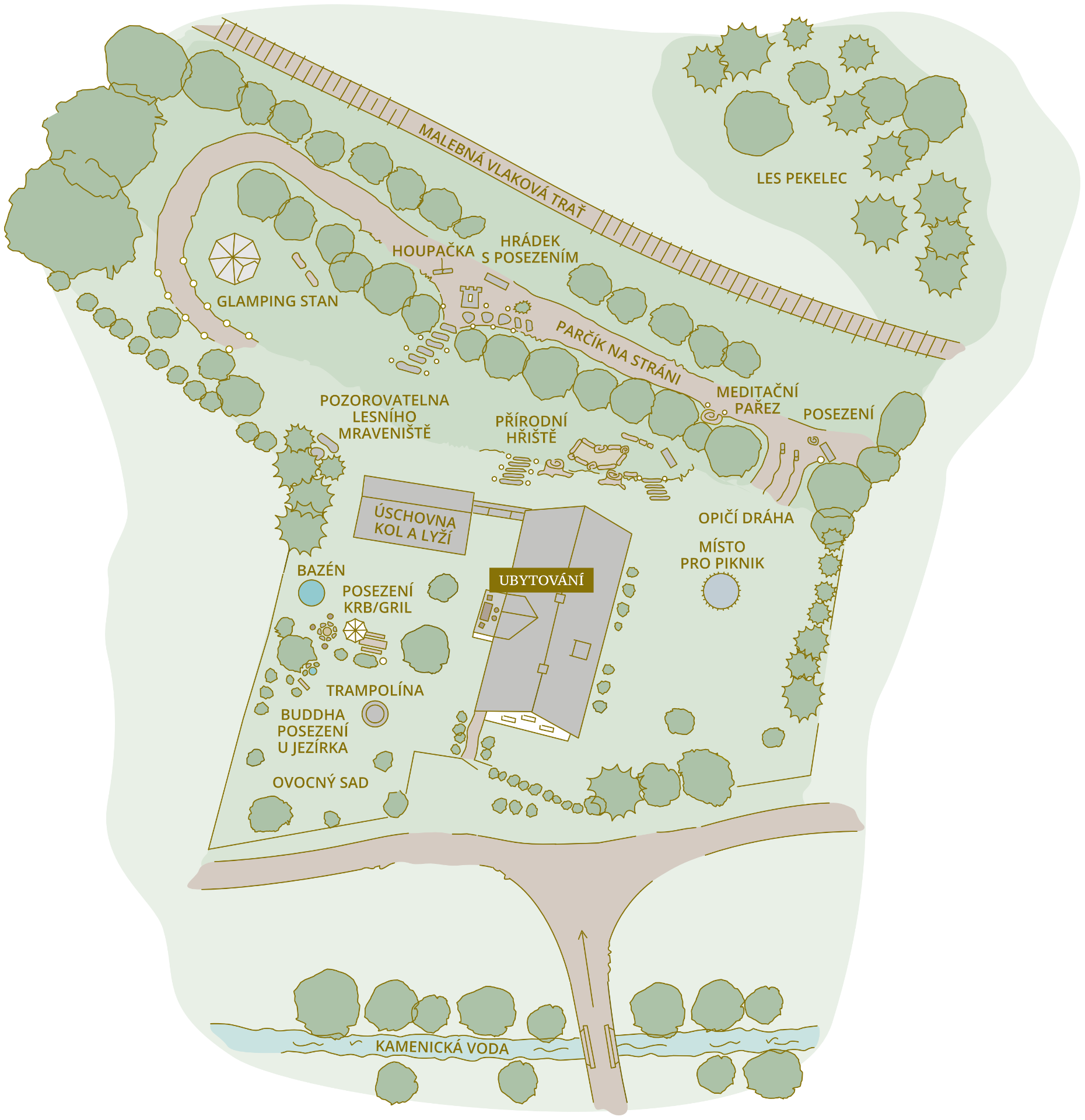 Přírodní hřiště pro děti: pískoviště, trampolína, opičí dráha, houpačka, balanční dráha z kmenů stromu, hra s kamínky, pozorovatelná lesního mraveniště, glamping stan s hračkami, meditační pařez