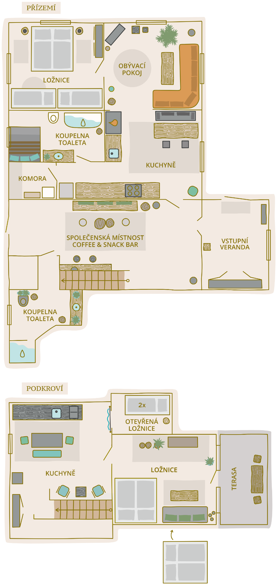 2. Ložnice v podkroví s terasou: manželská postel, rozkládací gauč (140 × 194 cm)